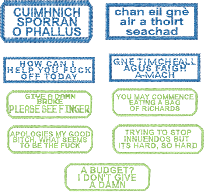 These are a bit more popular and we delight in making them. As with all patches this is not an exhaustive list. Please bring your custom words and we will make them stand out. Fully customizable. Up to three lines of text and up to 6 square inches.