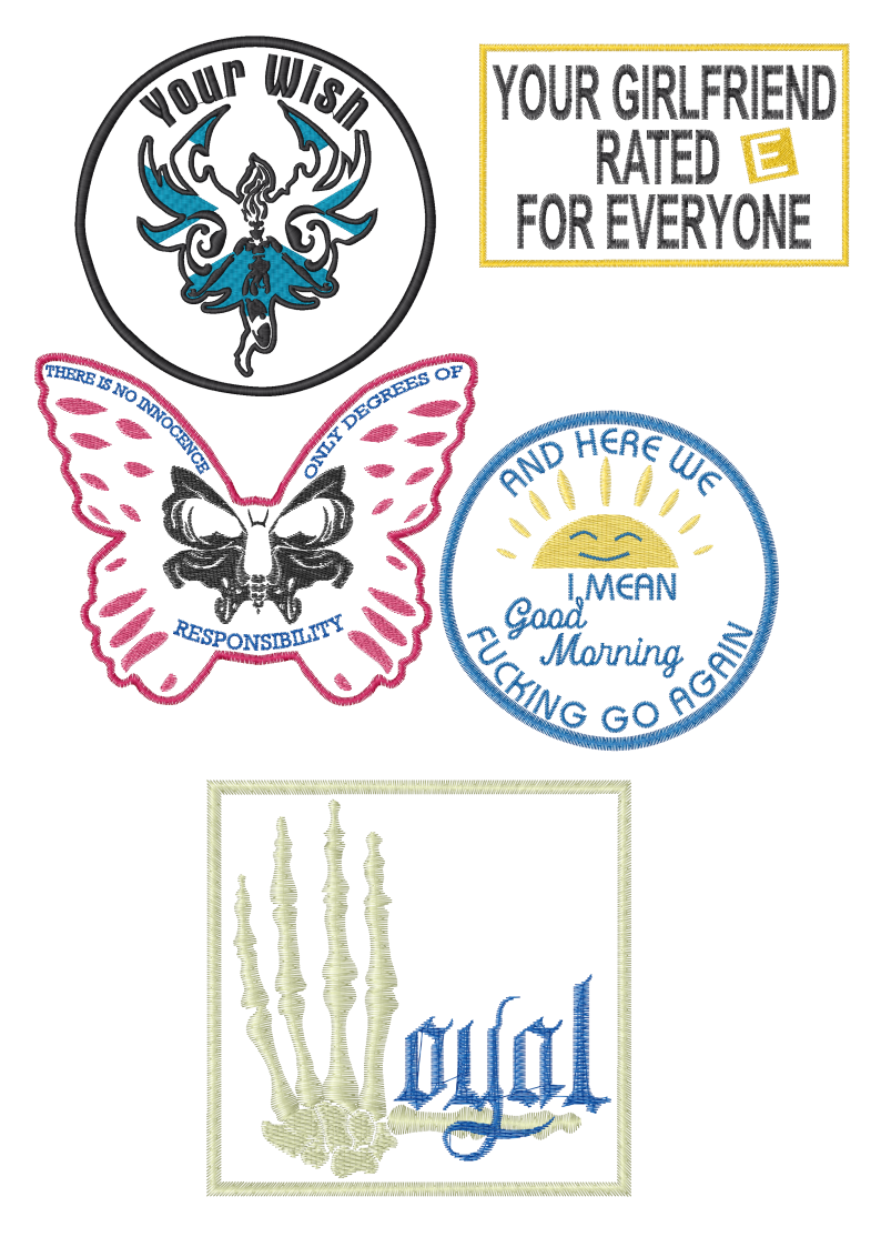 The big boys and girls can easily take up the back of a vest. These patches have very complex design elements and can be quite large if desired. Pricing for this last installment must be based on size and design.