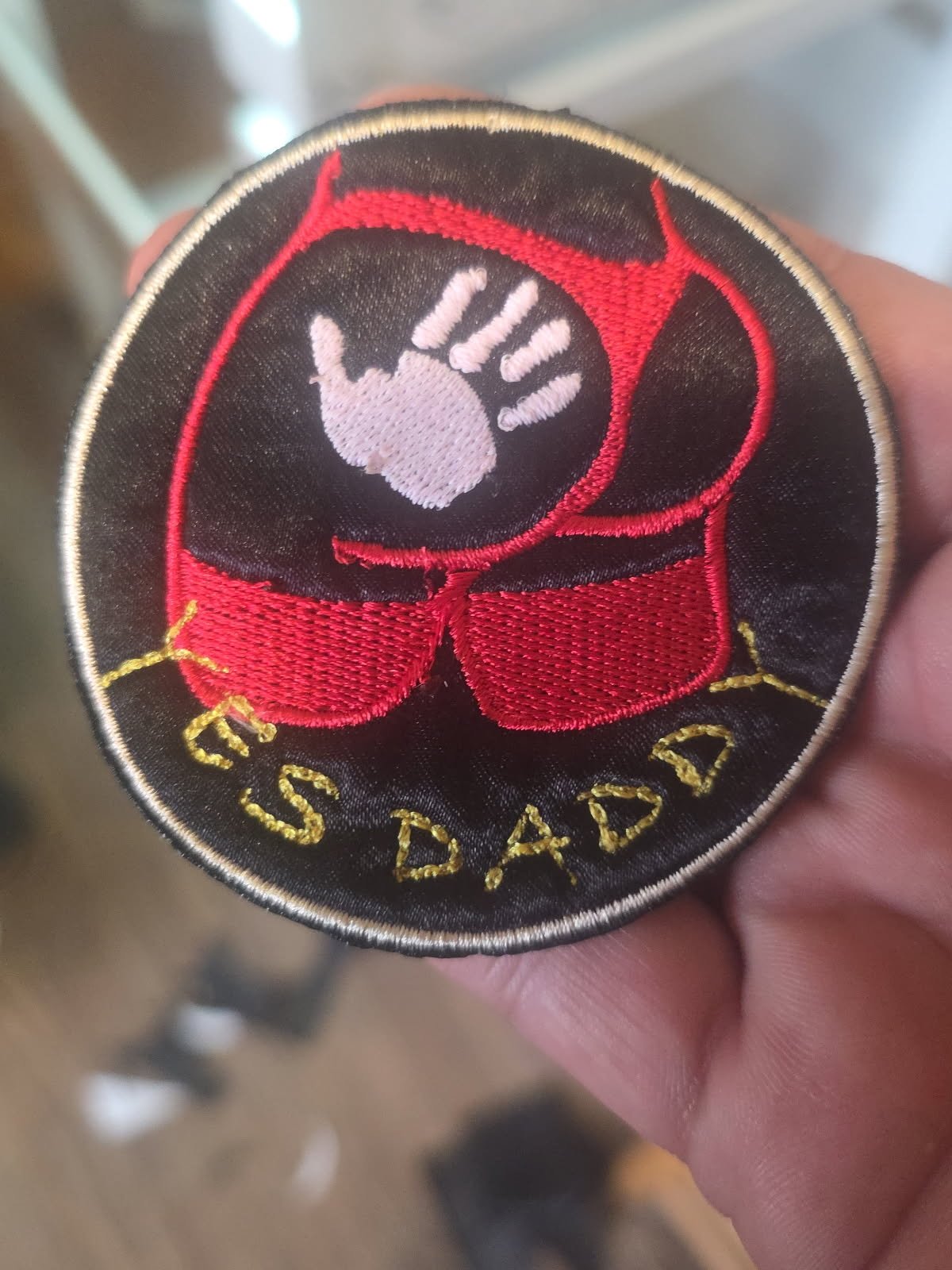 Yes daddy, 2.5 inches on black shimmer cloth, sew on $10.00, and iron on $14.00, colors and font is customizable.